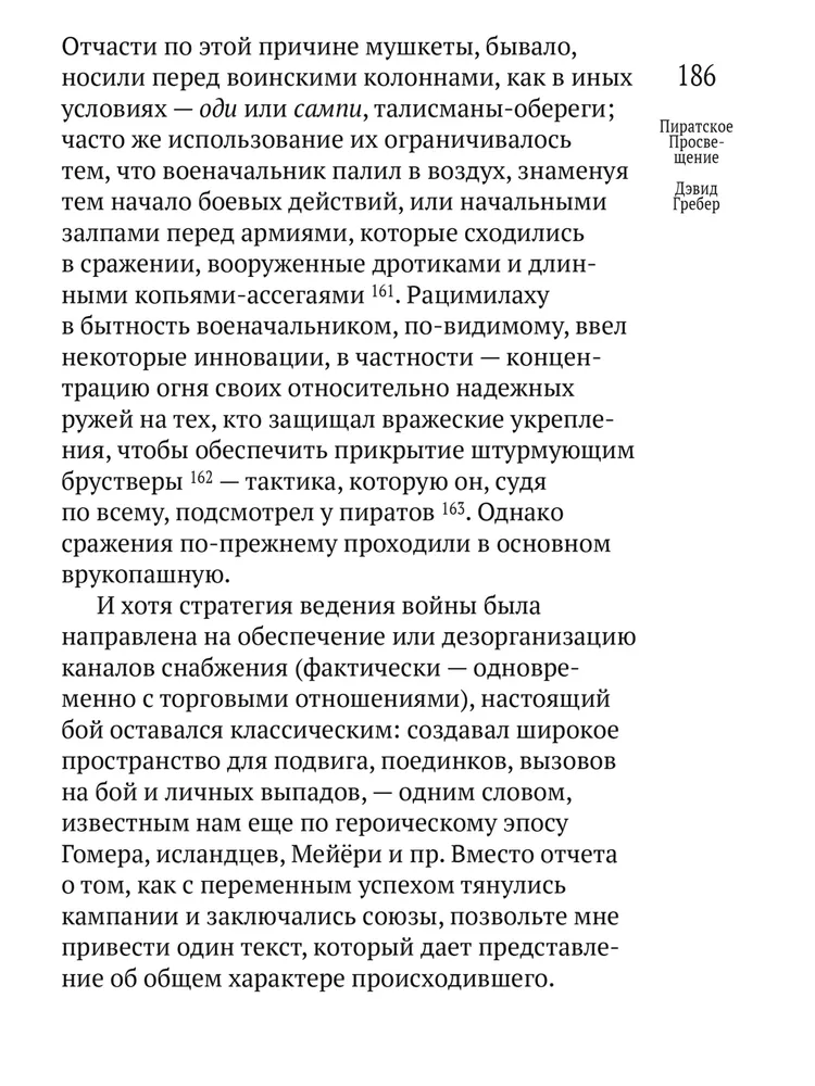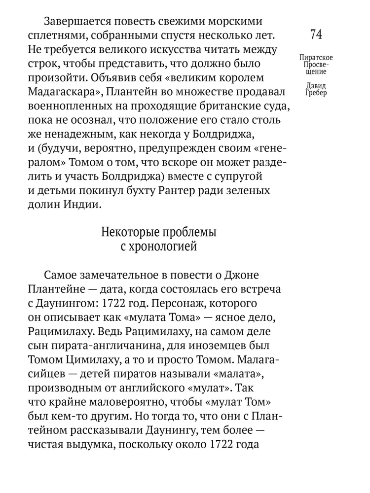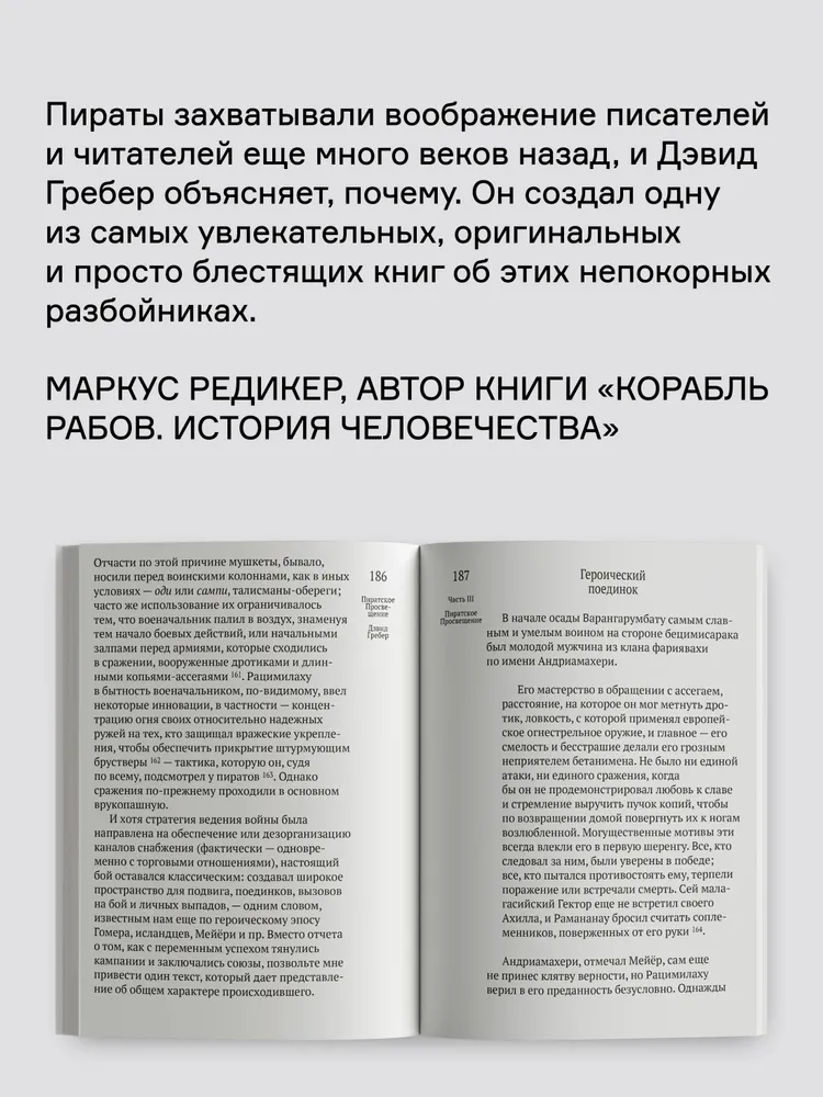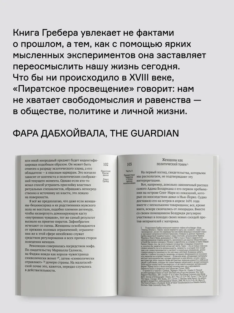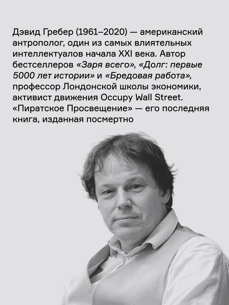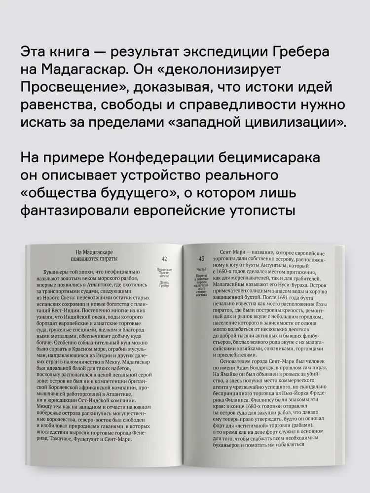 Гребер «деколонизирует Просвещение», доказывая, что истоки идей равенства, свободы и справедливости стоит искать за пределами «западной цивилизации». Он однозначно утверждает — те самые вымышленные эгалитарные «пиратские королевства» вроде Либерталии так или иначе существовали на самом деле. На примере Конфедерации бецимисарака Гребер описывает устройство реального проекта «общества будущего», о котором лишь фантазировал Томас Мор и другие авторы утопий.