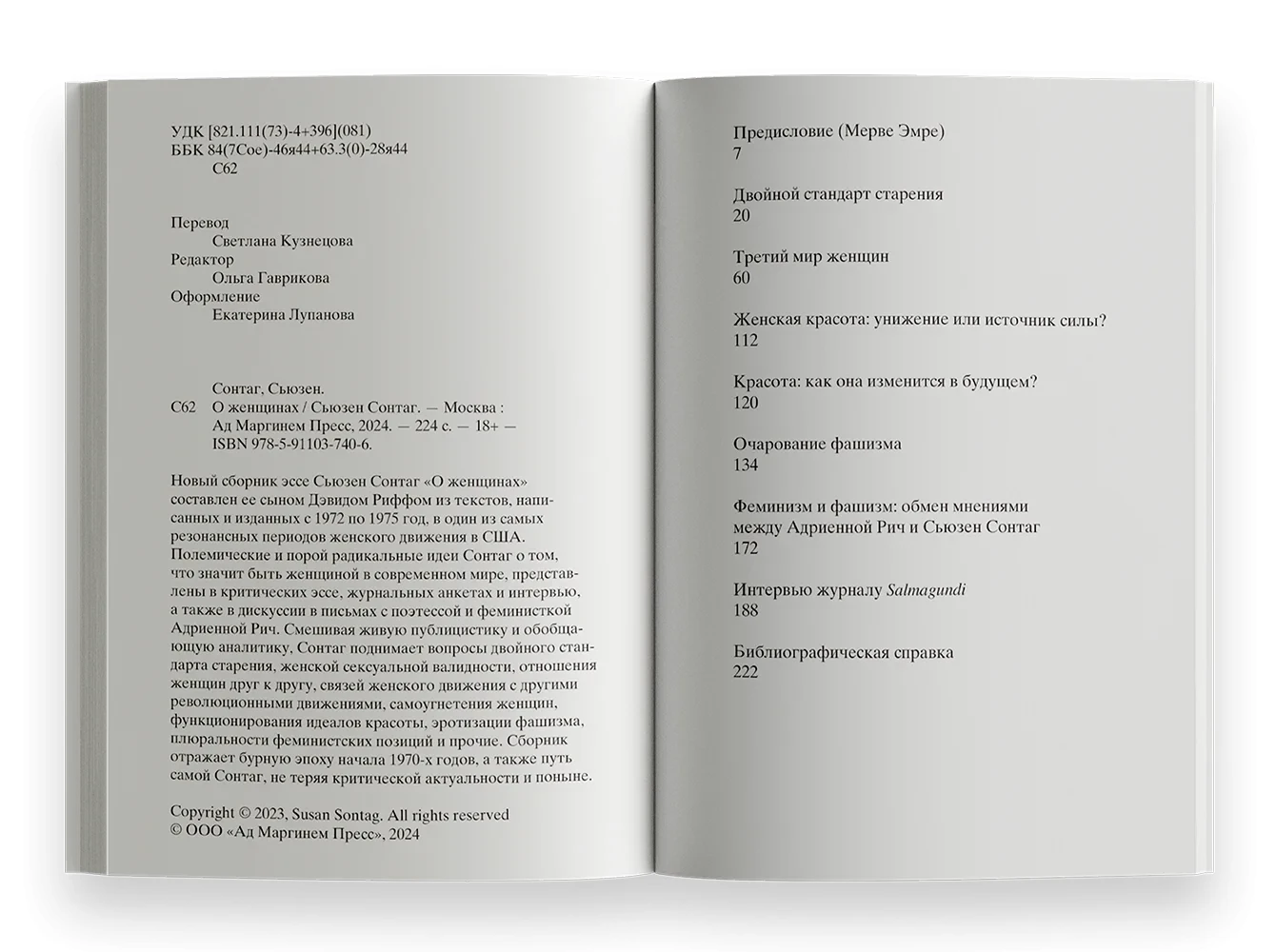 Новый сборник эссе Сьюзен Сонтаг «О женщинах», под редакцией ее сына Дэвида Риффа и с предисловием писательницы и критика Мерве Эмре, составляют работы, написанные и изданные с 1972 по 1975 год, в один из самых резонансных периодов женского движения в США.