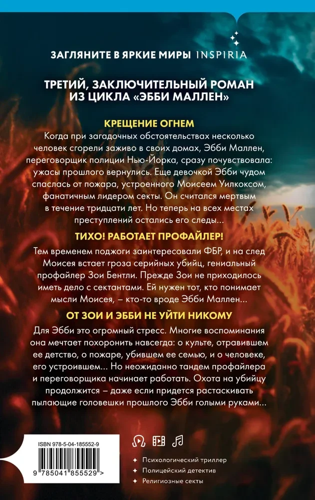 Когда при загадочных обстоятельствах несколько человек сгорели заживо в своих домах, Эбби Маллен, переговорщик полиции Нью-Йорка, сразу почувствовала: ужасы прошлого вернулись. Еще девочкой Эбби чудом спаслась от пожара, устроенного Моисеем Уилкоксом, фанатичным лидером секты. Он считался мертвым в течение тридцати лет. Но теперь на всех местах преступлений остались его следы…