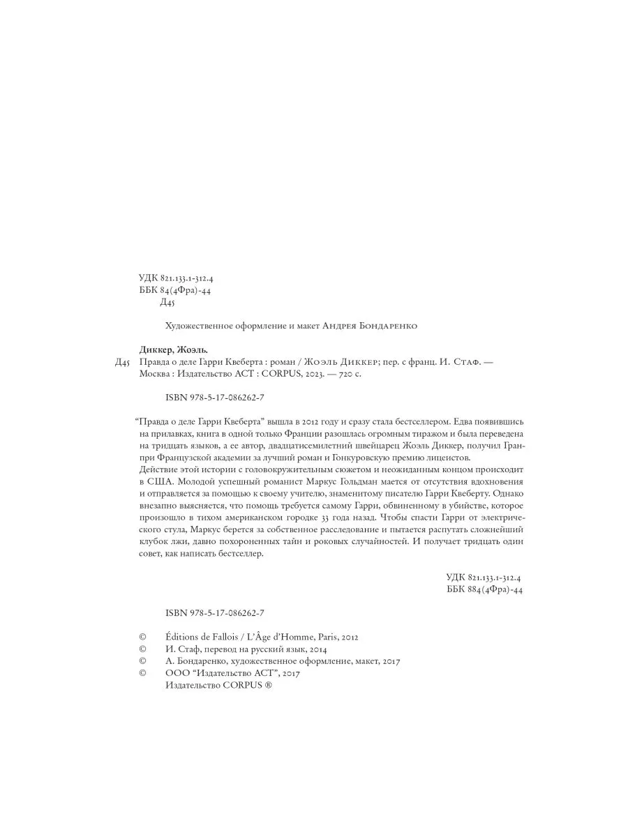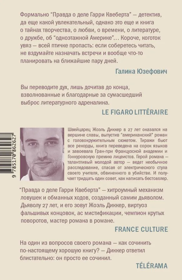 “Правда о деле Гарри Квеберта” вышла в 2012 году и сразу стала бестселлером. Едва появившись на прилавках, книга в одной только Франции разошлась огромным тиражом и была переведена на тридцать языков, а ее автор, двадцатисемилетний швейцарец Жоэль Диккер, получил Гранпри Французской академии за лучший роман и Гонкуровскую премию лицеистов.