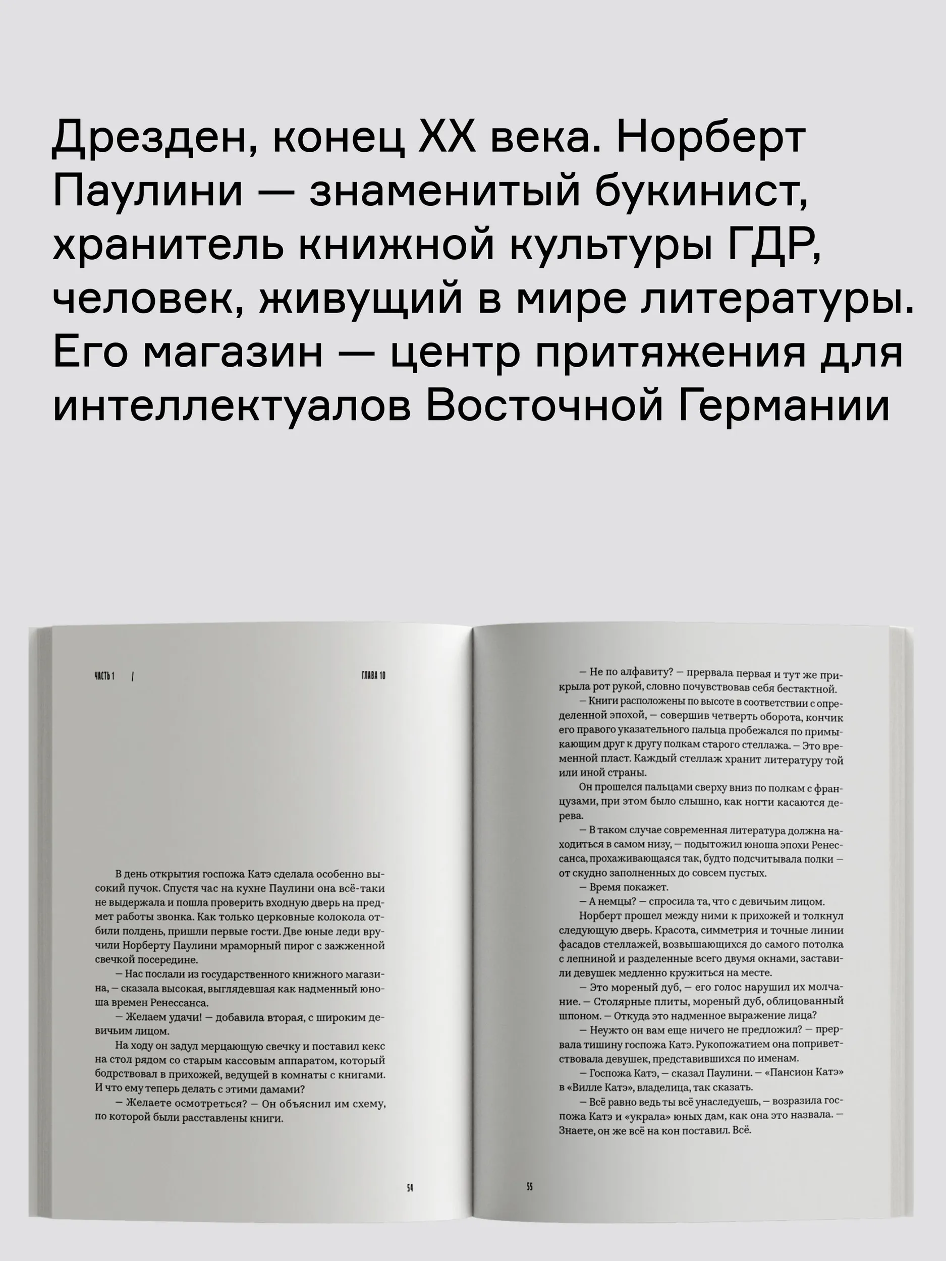 Книга начинается как легенда о знаменитом книжнике — аполитичном образованном представителе среднего класса, к которому стекается вся интеллектуальная публика Восточной Германии. Идиллия разрушается падением Берлинской стены: постепенно Паулини теряет покупателей, магазин и жену; его былая отстраненность от мира, находящегося за дверью книжного магазина, трансформируется в радикальные политические взгляды.
