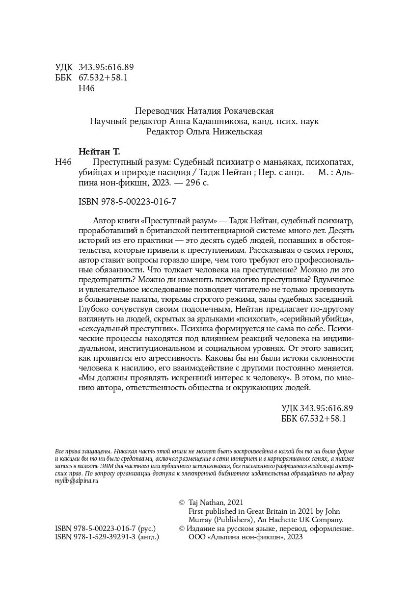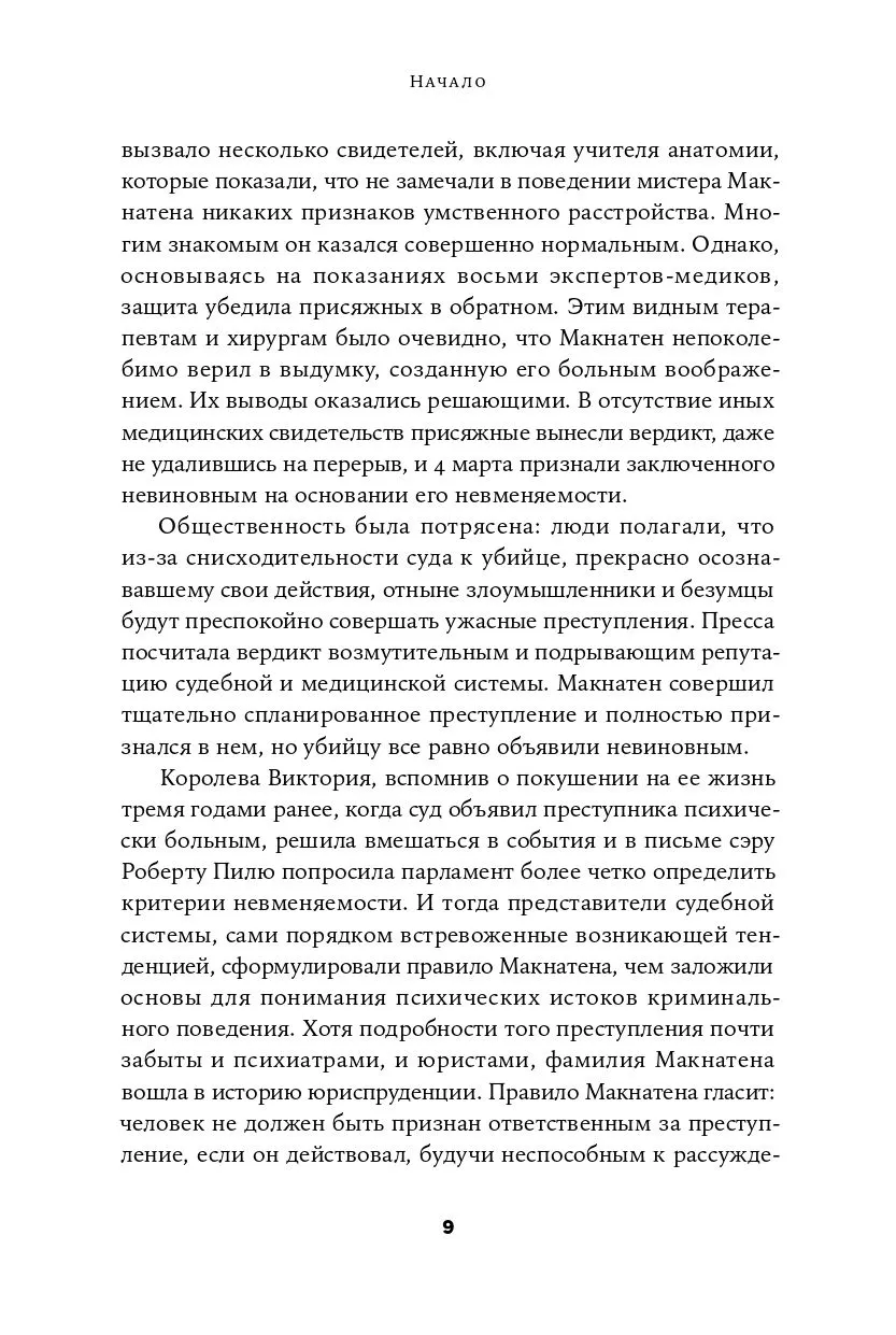 Десять историй реальных преступников с различными расстройствами личности и психическими заболеваниями, с которыми работал автор в тюремных больницах Великобритании, дают возможность понять, почему совершаются злодеяния и как судебная система определяет, кого следует наказывать, а кого — лечить.