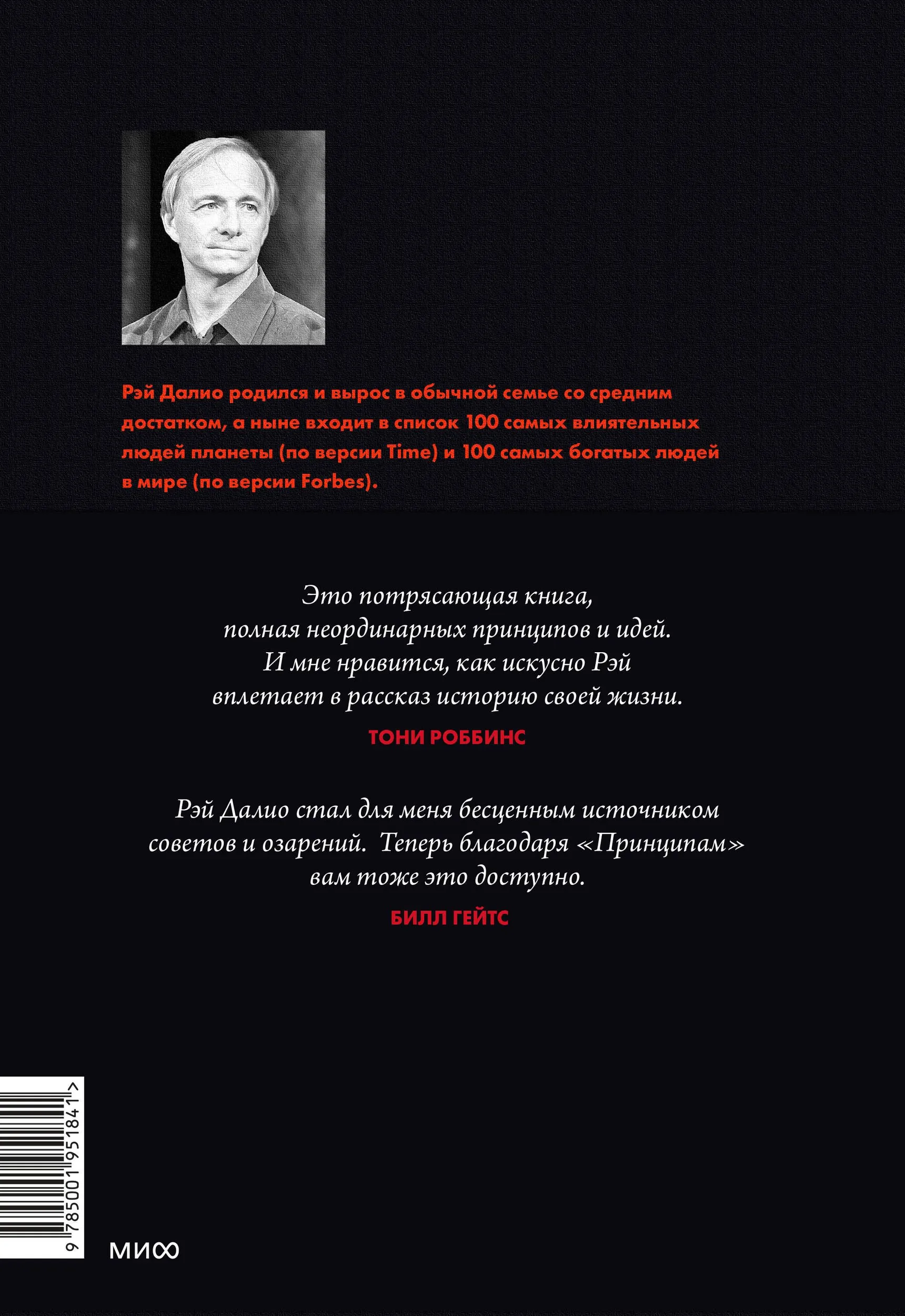 Рэй Далио вырос в обычной семье со средним достатком. Основанная им в 26 лет инвестиционная фирма Bridgewater Associates в течение следующих 40 лет стала пятой по важности частной компанией в США (по версии Fortune). Секрет ее устойчивости и успеха в том, что Рэй Далио в своей жизни и работе придерживается универсальных принципов, которые выкристаллизовались из ряда побед и поражений. Сила этих личных принципов такова, что они изменили всю отрасль: журнал CIO даже назвал Далио «Стивом Джобсом инвестирования».