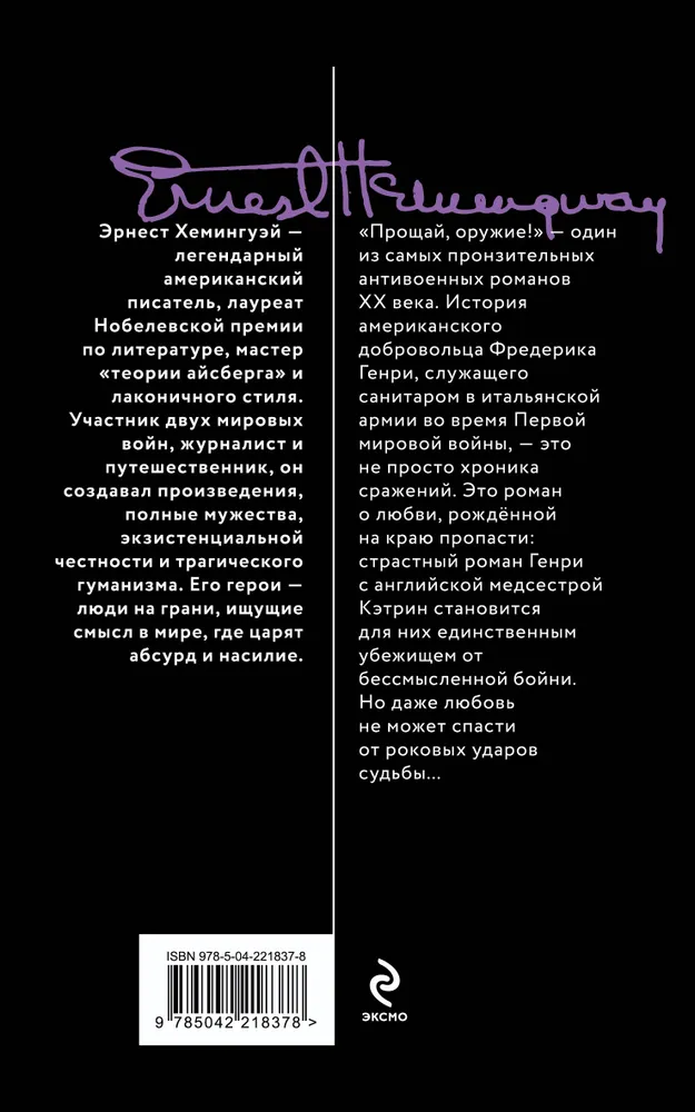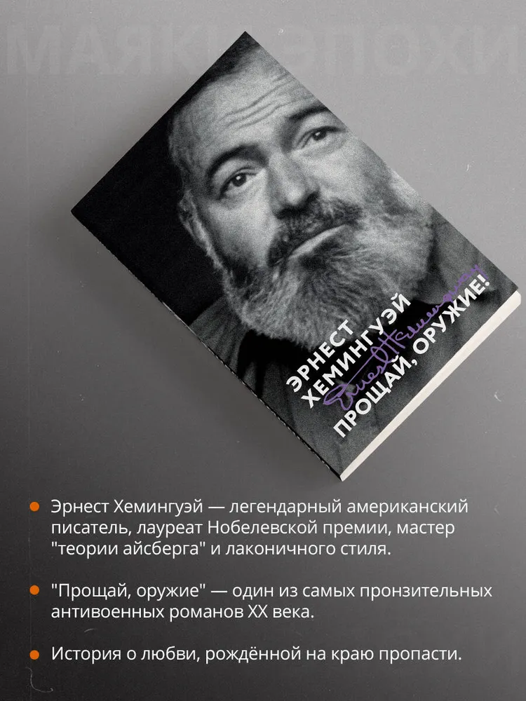 Эрнест Хемингуэй — легендарный американский писатель, лауреат Нобелевской премии по литературе, мастер "теории айсберга" и лаконичного стиля. Участник двух мировых войн, журналист и путешественник, он создавал произведения, полные мужества, экзистенциальной честности и трагического гуманизма. Его герои — люди на грани, ищущие смысл в мире, где царят абсурд и насилие.