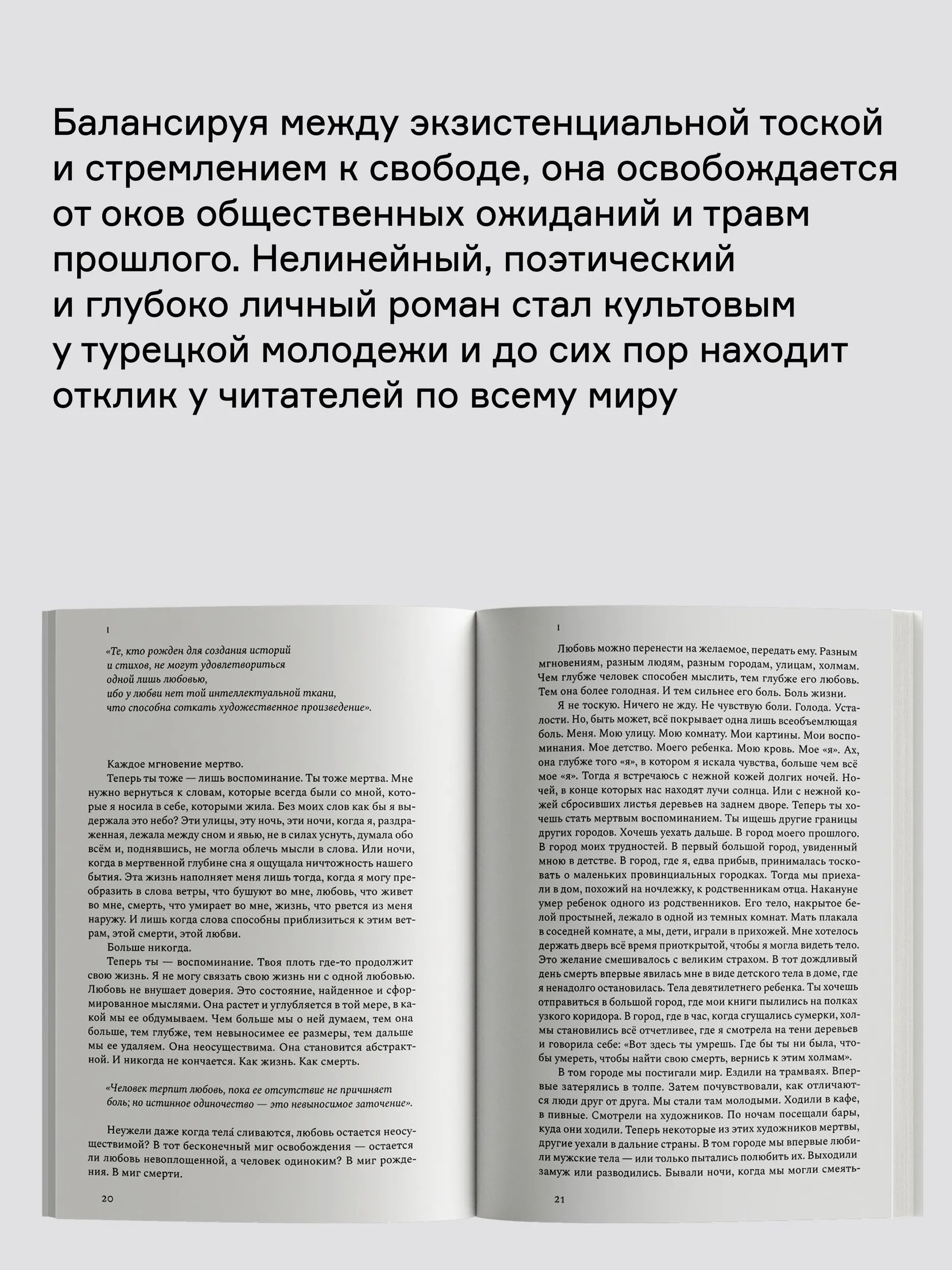 Нелинейный, поэтический, фрагментарный, глубоко личный, но при этом затрагивающий вечные темы любви, смерти и свободы, роман стал культовым у турецкой молодежи, был переведен на несколько языков и удостоен престижной премии Марбурга. До сих пор он увлекает и трогает читателей разных культур, возрастов и стран, приглашая присоединиться к этому путешествию на край жизни.