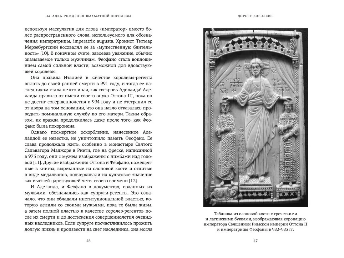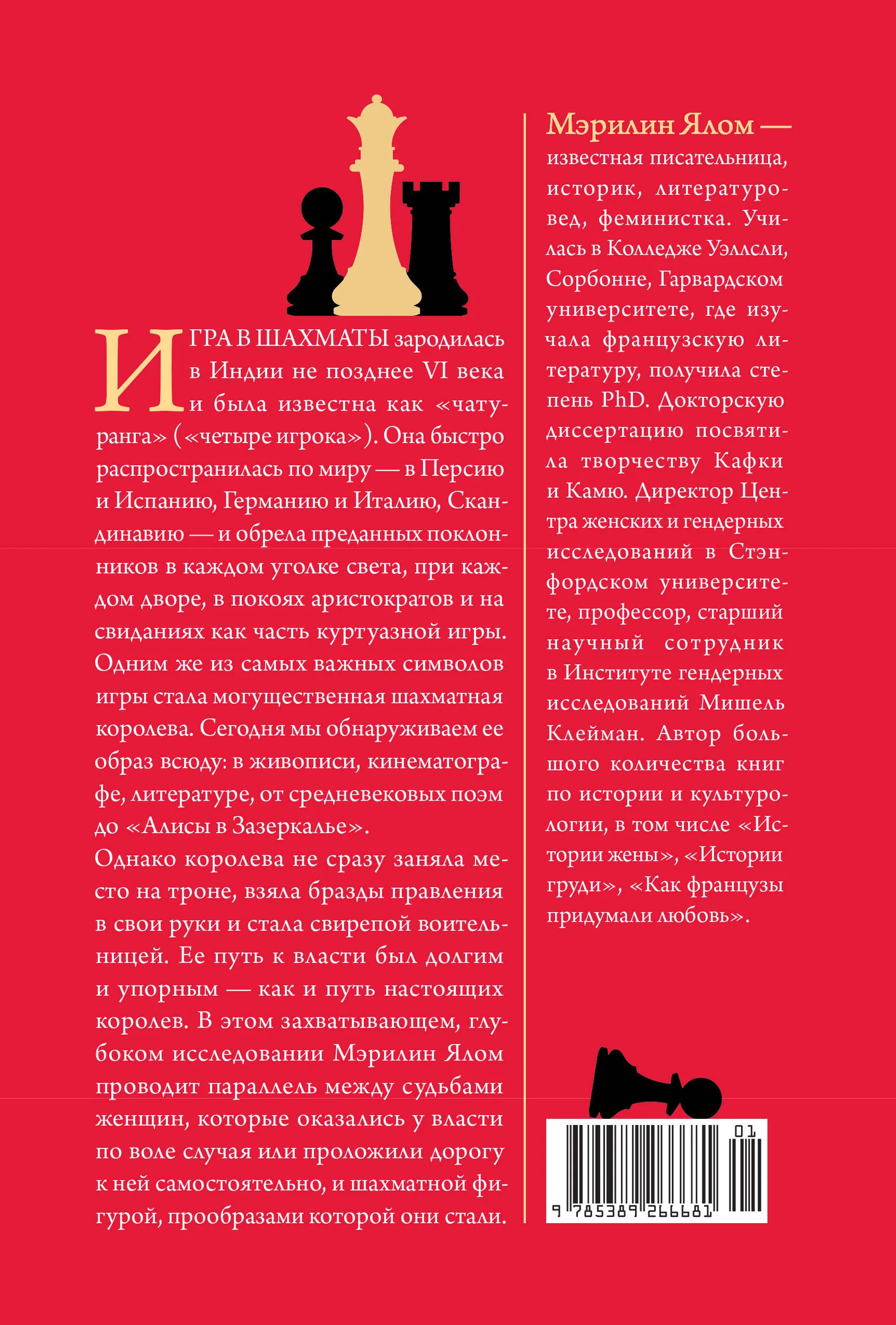 В повествовании выдающегося историка и феминистки Мэрилин Ялом оживают влиятельные правительницы прошлого: Матильда Тосканская и донья Уррака, Алиенора Аквитанская и Бланка Кастильская, Сигрид Гордая и Екатерина II. Ялом прослеживает удивительный и непредсказуемый путь королевы на шахматной доске от самых первых редких упоминаний этой фигуры до ее блистательного возвышения в эпоху правления Изабеллы Кастильской, от шахмат острова Льюис и средневековых поэм до «Алисы в Зазеркалье». Это многослойная, захватывающая история средневековых королевских дворов, борьбы за власть, политических и любовных интриг.