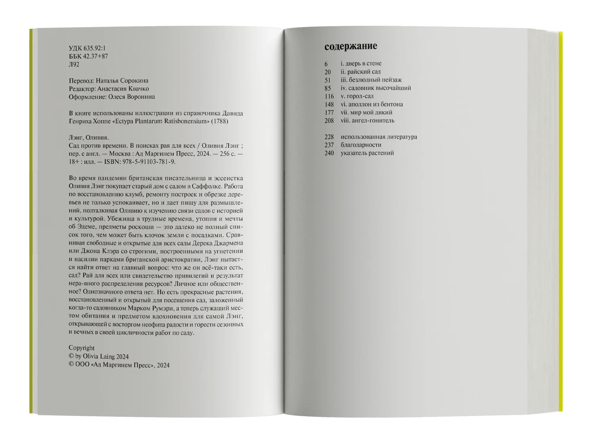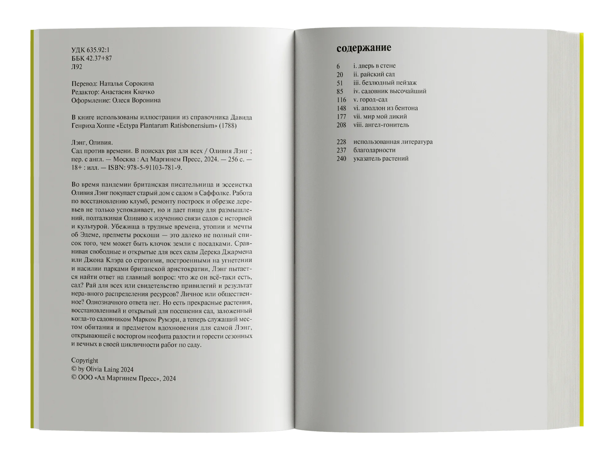 Во время пандемии британская писательница и эссеистка Оливия Лэнг покупает старый дом с садом в Саффолке. Работа по восстановлению клумб, ремонту построек и обрезке деревьев не только успокаивает, но и дает пищу для размышлений, подталкивая Оливию к изучению связи садов с историей и культурой. Убежища в трудные времена, утопии и мечты об Эдеме, предметы роскоши — это далеко не полный список того, чем может быть клочок земли с посадками. Сравнивая свободные и открытые для всех сады Дерека Джармена или Джона Клэра со строгими, построенными на угнетении и насилии парками британской аристократии, Лэнг пытается найти ответ на главный вопрос: что же он всё-таки есть, сад? Рай для всех или свидетельство привилегий и результат неравного распределения ресурсов? Личное или общественное? Однозначного ответа нет. Но есть прекрасные растения, восстановленный и открытый для посещения сад, заложенный когда-то садовником Марком Румэри, а теперь служащий местом обитания и предметом вдохновения для самой Лэнг, открывающей с восторгом неофита радости и горести сезонных и вечных в своей цикличности работ по саду.