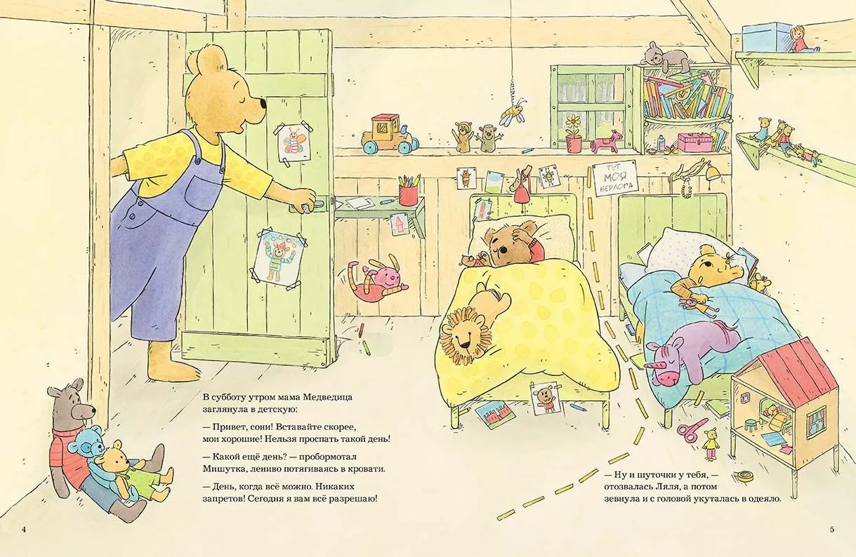 Однажды субботним утром, к огромному удивлению Ляли и Мишутки, мама Медведица объявила, что их ждёт очень необычный день: день, когда всё можно. Мама пообещала, что сегодня ничего не будет запрещать своим медвежатам, и они смогут делать всё, что захотят. Конфеты на завтрак? Пожалуйста. Шоколад на обед? Само собой. Надуть бассейн и плескаться прямо в комнате? Не вопрос. На кроватях попрыгать? Сколько угодно! Подушечный бой? Вперёд!