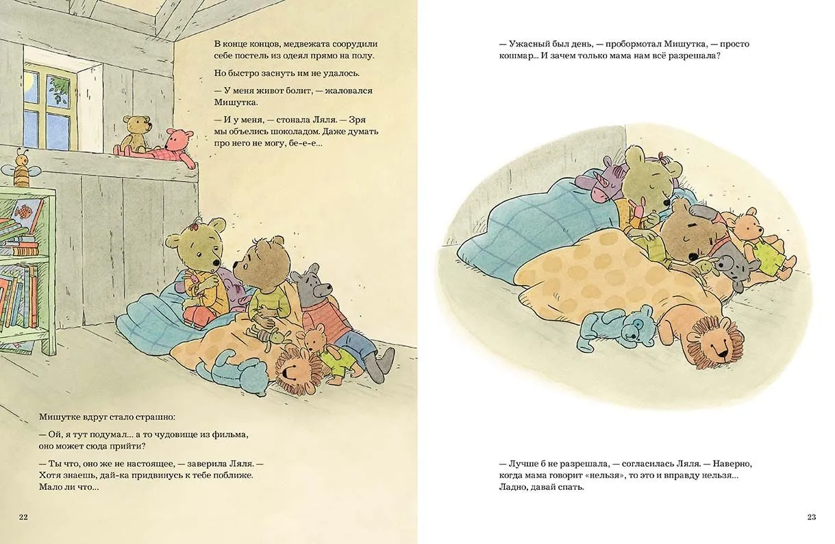 Ляля и Мишутка веселились на всю катушку. Сначала они были в полном восторге, но под вечер радость поутихла. От сладкого разболелись животы, кроватки, не выдержав прыжков, сломались, одежда промокла, подушки во время подушечных боёв порвались. Усталым бедняжкам было даже негде прилечь! К тому же повсюду чудовищный беспорядок, который медвежатам предстоит убирать. «И зачем только мама нам всё разрешала?» ̶ вздыхают Ляля с Мишуткой, осознавая последствия своих необдуманных действий.