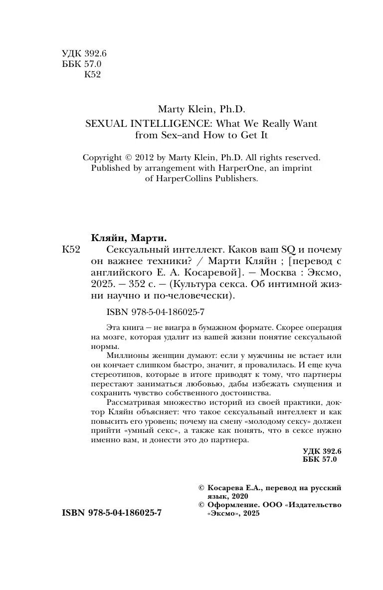 Рассматривая множество историй из своей практики, доктор Кляйн объясняет: что такое сексуальный интеллект и как повысить его уровень; почему на смену «молодому сексу» должен прийти «умный секс», а также как понять, что в сексе нужно именно вам, и донести это до партнера.