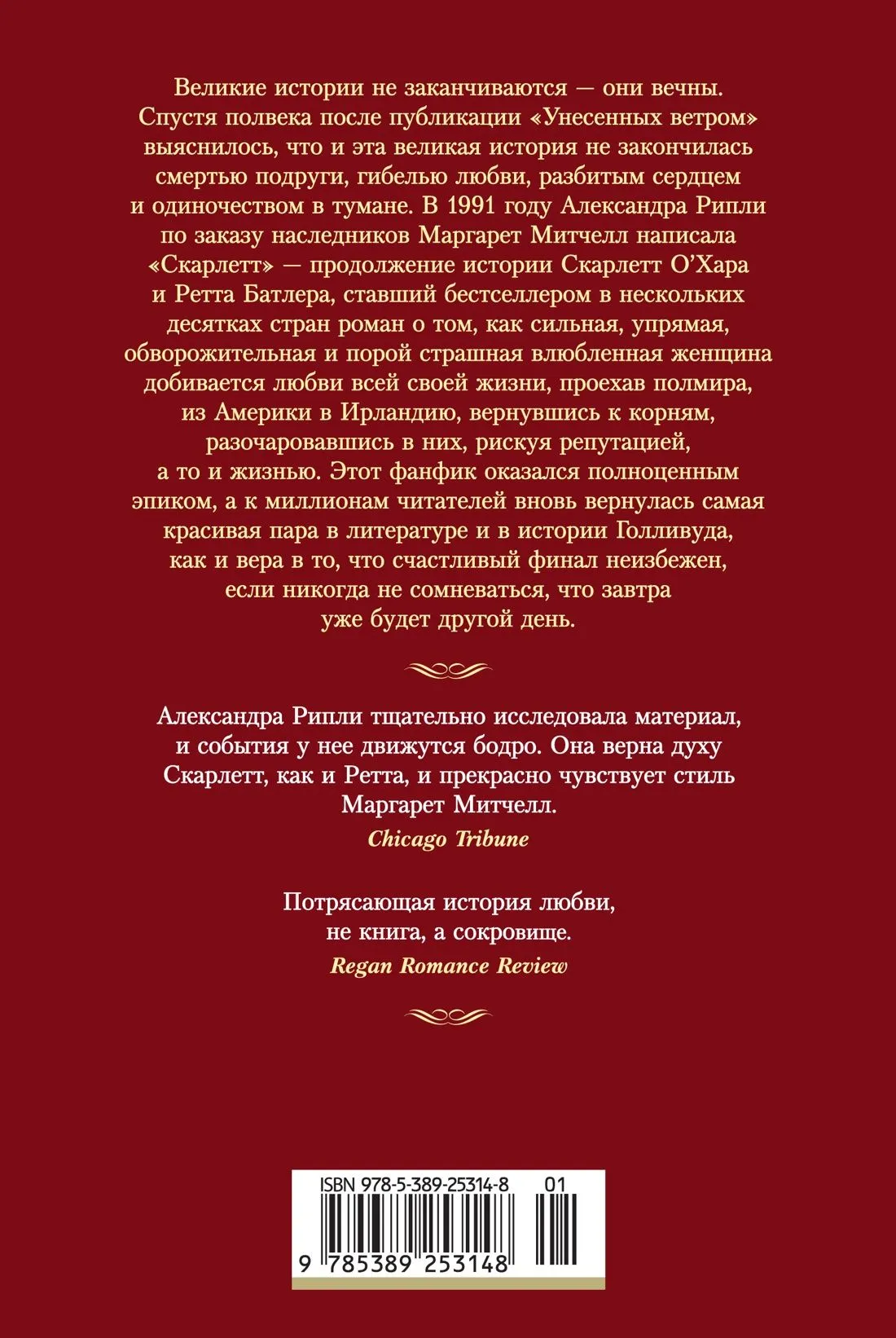 В 1991 году Александра Рипли по заказу наследников Маргарет Митчелл написала «Скарлетт» — продолжение истории Скарлетт О’Хара и Ретта Батлера, ставший бестселлером в нескольких десятках стран роман о том, как сильная, упрямая, обворожительная и грозная влюбленная женщина добивается любви всей своей жизни, проехав полмира, из Америки в Ирландию, вернувшись к корням, разочаровавшись в них, рискуя репутацией, а то и жизнью.