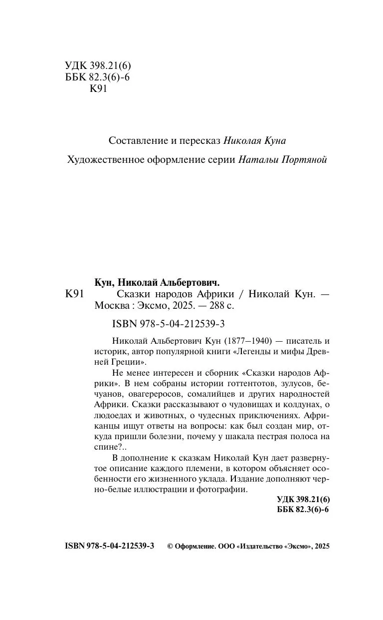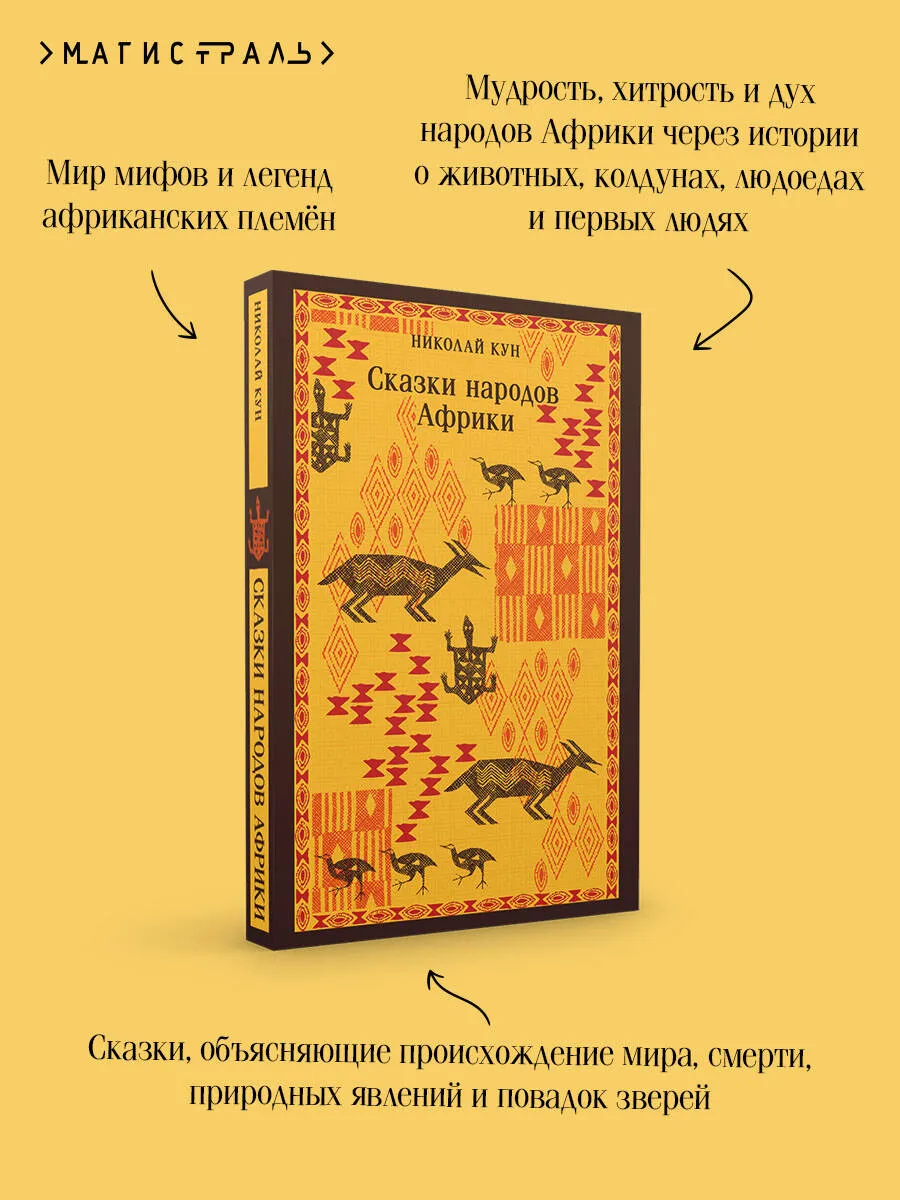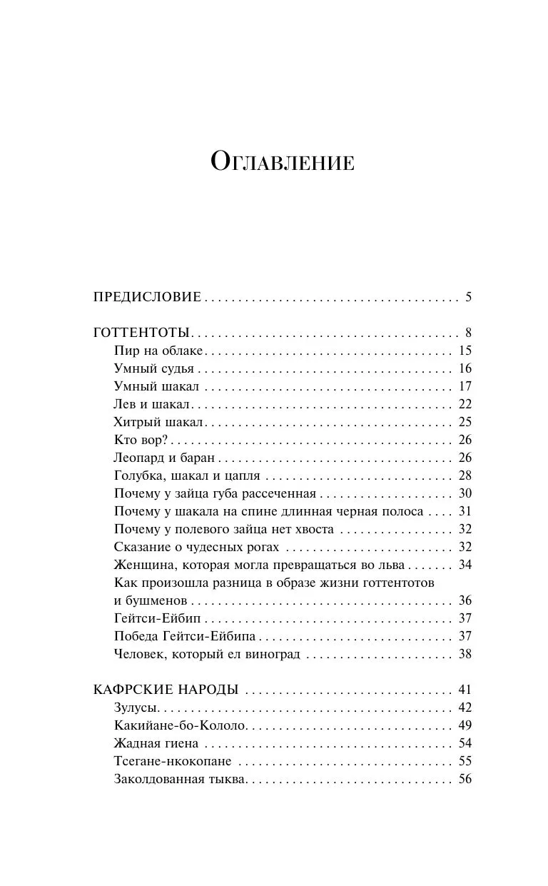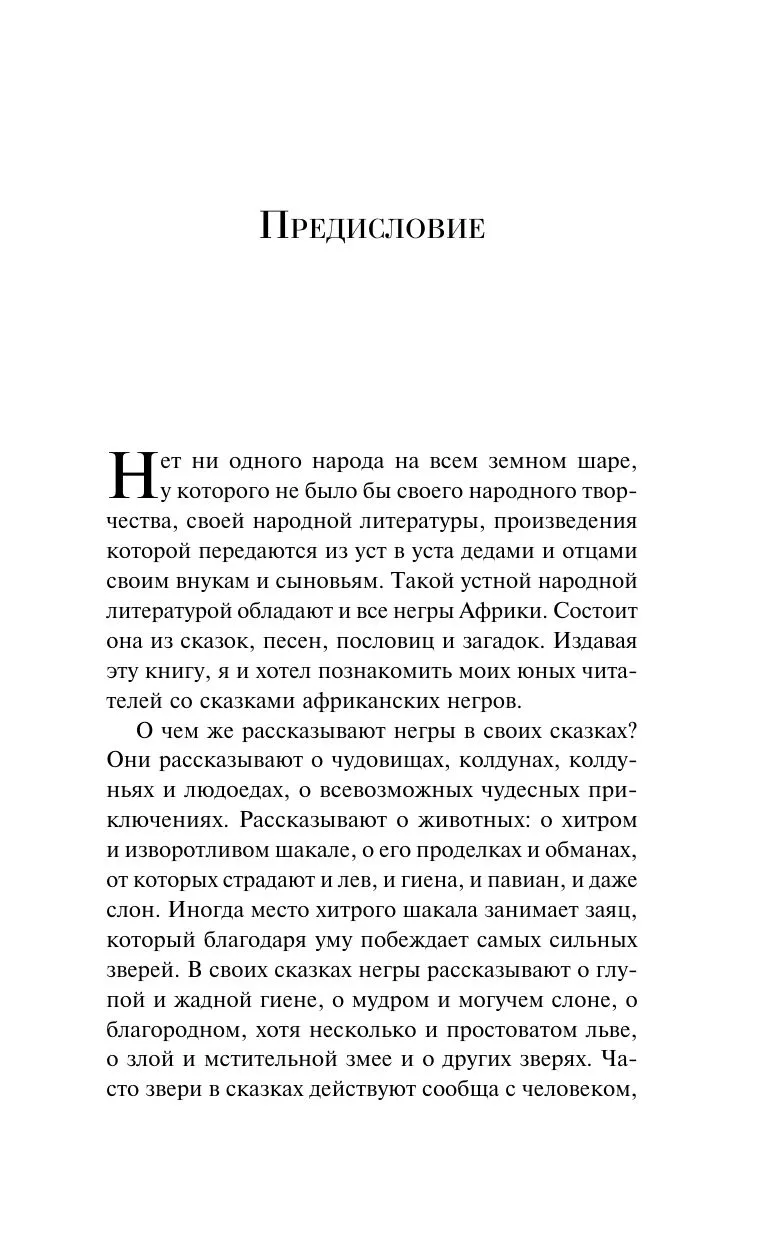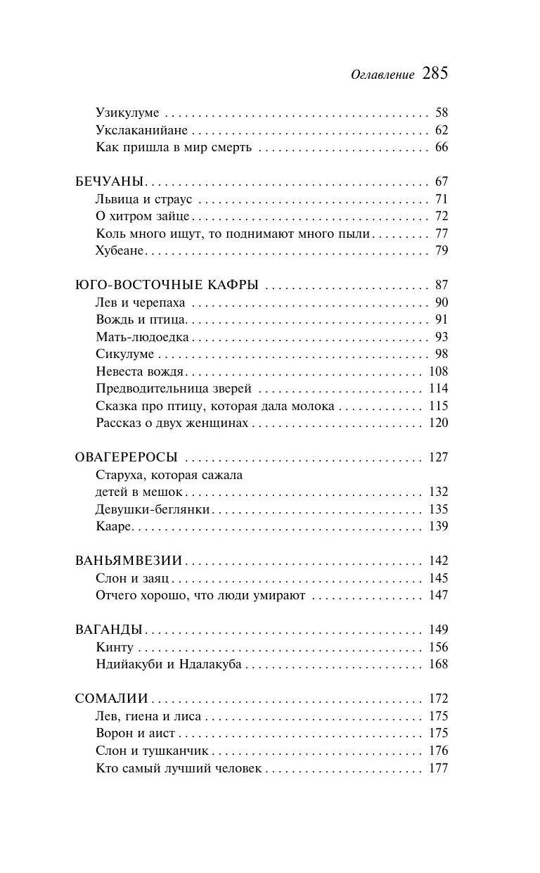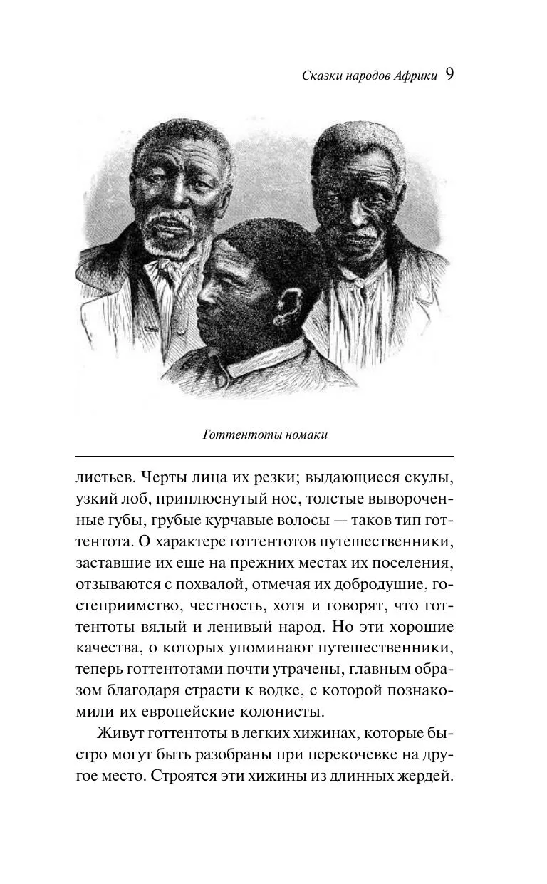 Не менее интересен и сборник «Сказки народов Африки». В нем собраны истории готтентотов, зулусов, бечуанов, овагереросов, сомалийцев и других народностей Африки. Сказки рассказывают о чудовищах и колдунах, о людоедах и животных, о чудесных приключениях. Африканцы ищут ответы на вопросы: как был создан мир, откуда пришли болезни, почему у шакала пестрая полоса на спине?..