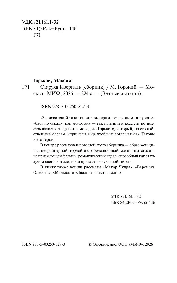 Кроме рассказа "Старуха Изергиль", где излагается знаменитая легенда о Данко и его горящем сердце, в сборник вошли тексты "Макар Чудра", "Варенька Олесова", "Мальва" и "Двадцать шесть и одна".