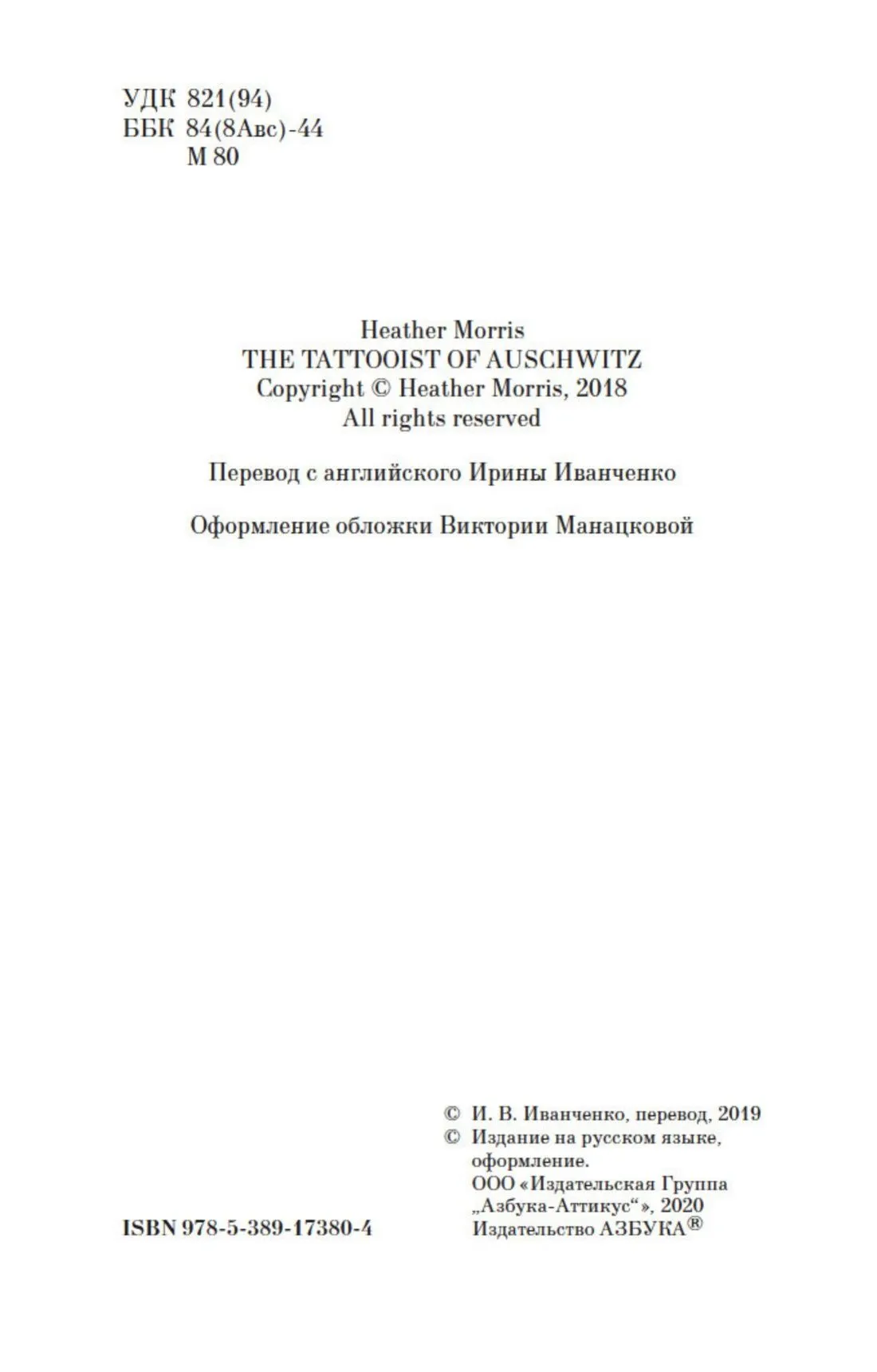 Этот роман Хезер Моррис – свидетельство человеческой силы воли, любви. Если вы ищете захватывающее чтение, книгу про войну, сложные человеческие судьбы, отношения, любовь, то “Татуировщик из Освенцима” – именно то, что вам нужно.
