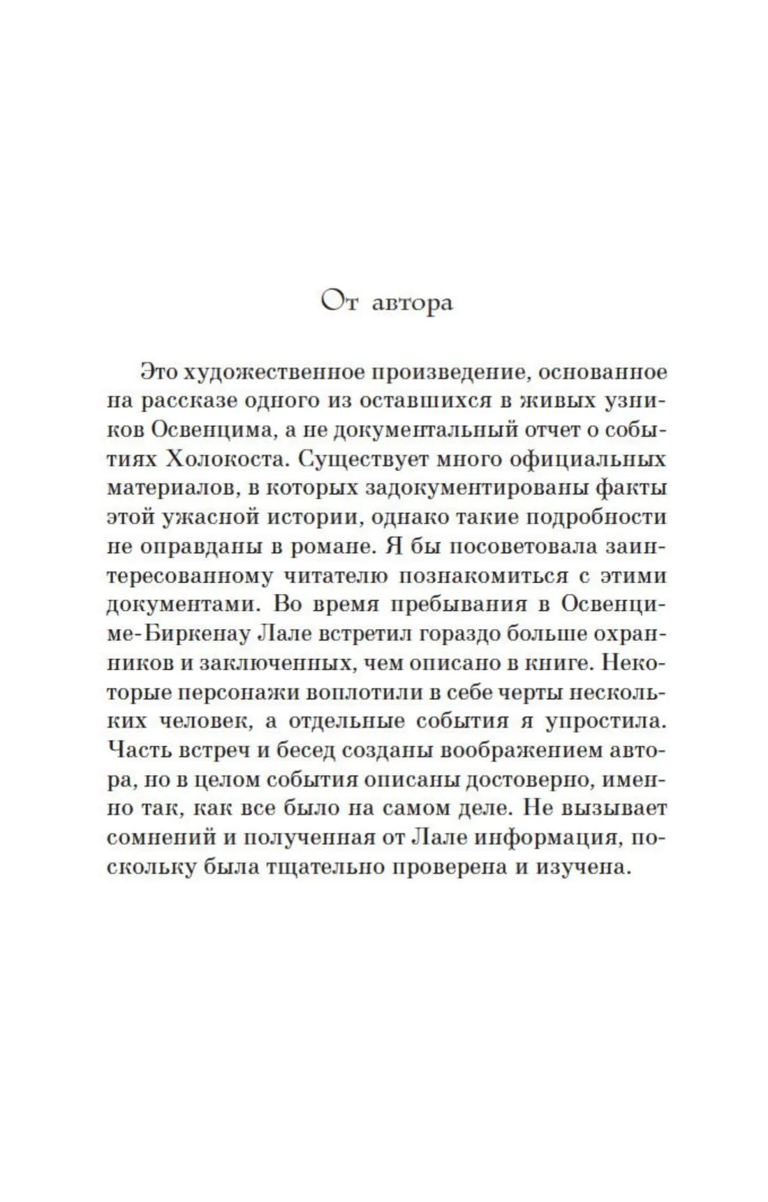 Основанный на реальных событиях жизни Людвига (Лале) Соколова, роман Хезер Моррис является свидетельством человеческого духа и силы любви, способной расцветать даже в самых темных местах. И трудно представить более темное место, чем концлагерь Освенцим Биркенау.