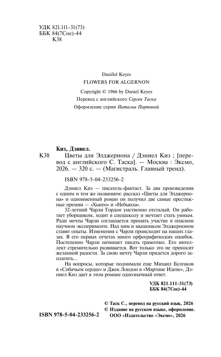 За два произведения с одним и тем же названием: рассказ «Цветы для Элджернона» и одноименный роман он получил самые престижные премии — «Хьюго» и «Небьюла». 32-летний Чарли Гордон умственно отсталый. Он работает уборщиком, ходит в спецшколу и мечтает стать умным. Ради мечты Чарли соглашается принять участие в опасном научном эксперименте. Над ним и мышонком Элджерноном ставят опыты. Изменения с Чарли происходят на наших глазах. В его первых отчетах много орфографических ошибок. Постепенно Чарли начинает писать грамотнее. Его интеллект стремительно развивается. Вот только это не приносит желанной радости. За свою мечту Чарли придется дорого заплатить… На вопросы, которые поднимали еще Михаил Булгаков в «Собачьем сердце» и Джек Лондон в «Мартине Идене», Дэниел Киз дает в этом романе однозначный ответ.