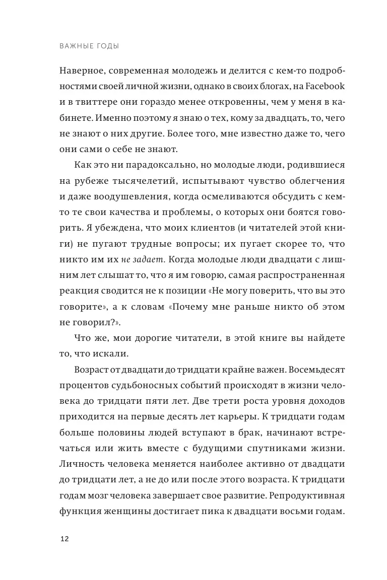 Книга содержит все необходимые инструменты для максимально результативного использования самых важных десяти лет. Автор делится тем, что знают о критической важности этого периода психологи, социологи, неврологи, экономисты и топ-менеджеры, занимающиеся кадровой политикой. То, что вы делаете и чего не делаете в период с двадцатого по тридцатый год, может оказать огромное воздействие на вашу карьеру, личностный рост, развитие мозга, ваши взаимоотношения и на построение деловых и личных связей.