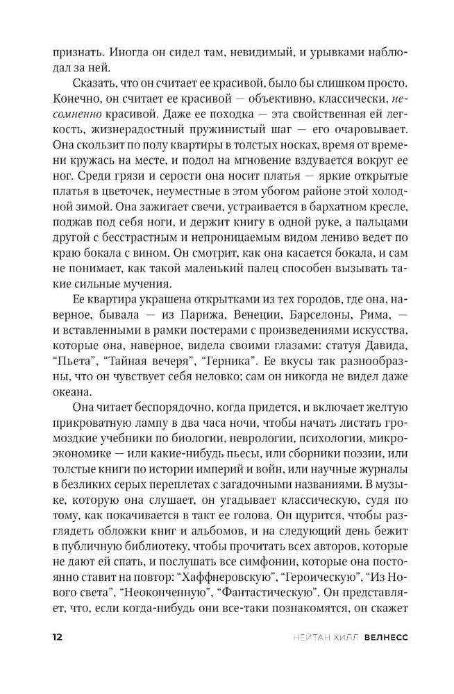 Пронзительный и остроумный роман о браке и связях, которые удерживают людей вместе. Разбирая нелепости современного общества, «Велнесс» иронично и трогательно переосмысливает классическую историю любви. Как и что люди рассказывают о себе, о своих чувствах, о своих отношениях? Это одновременно и очень смешная, и почти душераздирающая книга, и определенно — по-настоящему умная и глубокая.