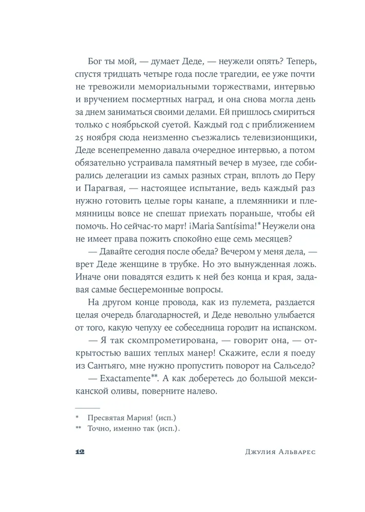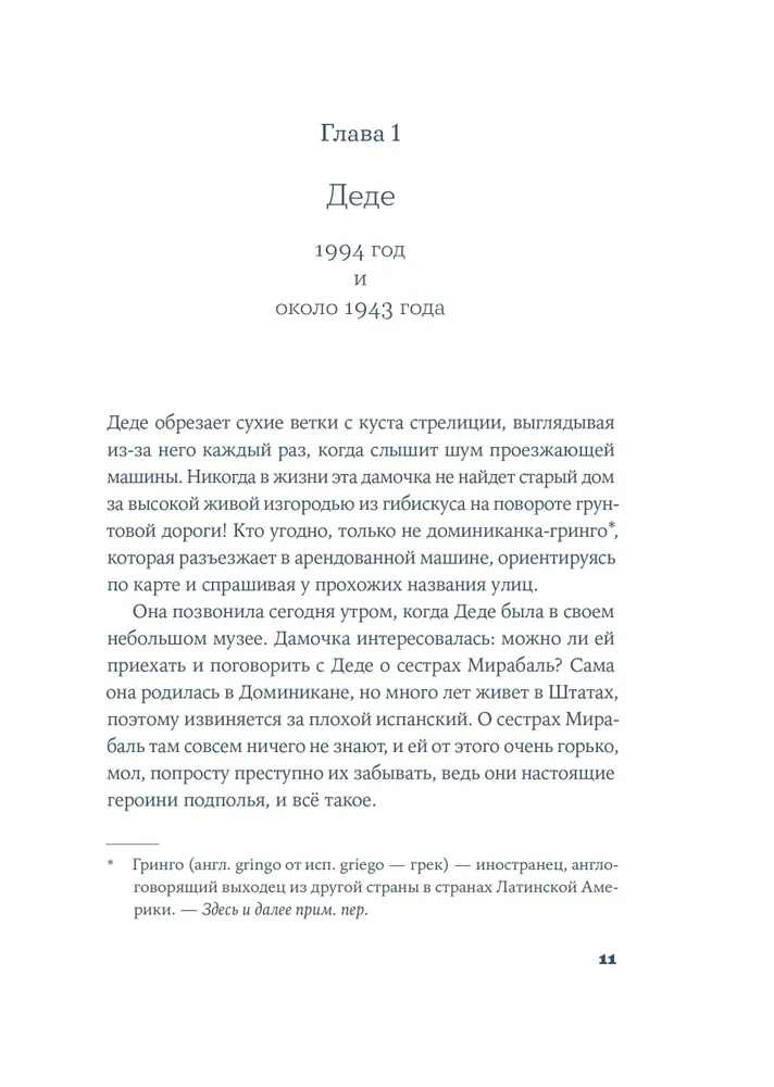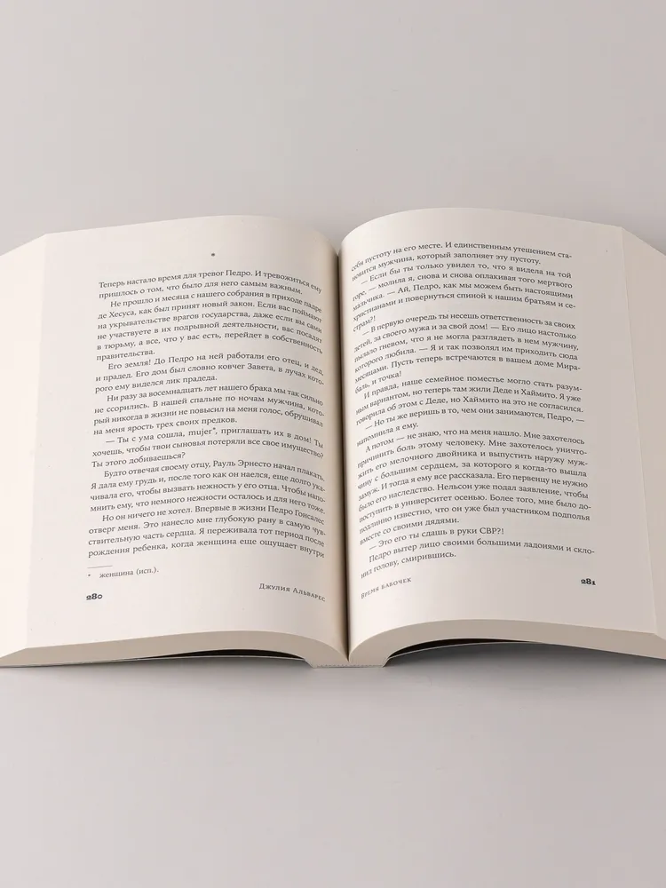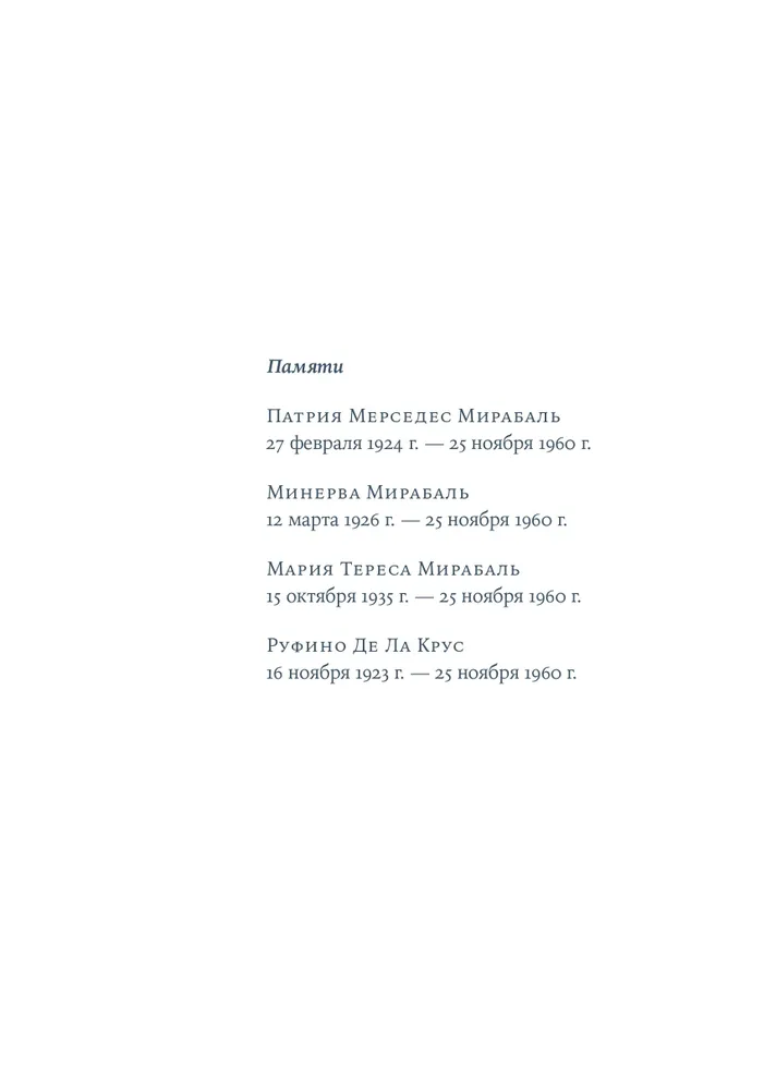 Каждая экскурсия по дому с портретами на стенах напоминает Деде о прошлом. Только «сестра, которая выжила» знает, какими искренними и смелыми были Las Mariposas — «Бабочки», героини Доминиканской Республики. Религиозная Патрия, амбициозная Минерва и беззаботная Мате взрослели, влюблялись и мечтали о будущем. Но режим Рафаэля Трухильо отравлял жизнь людей, превращая их родину в клетку размером со всю страну. Для Джулии Альварес, семья которой едва успела спастись от расправы диктатора, история сестер Мирабаль глубоко личная. Писательница дала слово каждой из «Бабочек». Она возвратила женщинам, боровшимся с тираном и превратившимся в национальный миф, право сомневаться, злиться, трусить, презирать — быть собой.