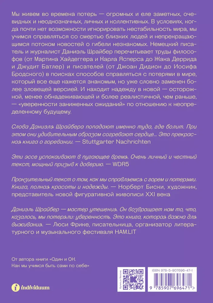 Мы живем во времена потерь — огромных и еле заметных, очевидных и неоднозначных, личных и коллективных. В условиях, когда почти нет возможности игнорировать нестабильность мира, мы учимся справляться со смертью близких людей и непрекращающимся потоком новостей о гибели незнакомых. Немецкий писатель и журналист Даниэль Шрайбер перечитывает труды философов (от Мартина Хайдеггера и Карла Ясперса до Жака Деррида и Джудит Батлер) и писателей (от Джоан Дидион до Иосифа Бродского) в поисках способов справляться с потерями в мире, который все еще кажется знакомым, но уже словно заменен более зловещей версией. И находит надежду в новой — осторожной, менее обнадеживающей и более реалистичной, чем раньше, — «уверенности заниженных ожиданий» по отношению к неопределенному будущему.