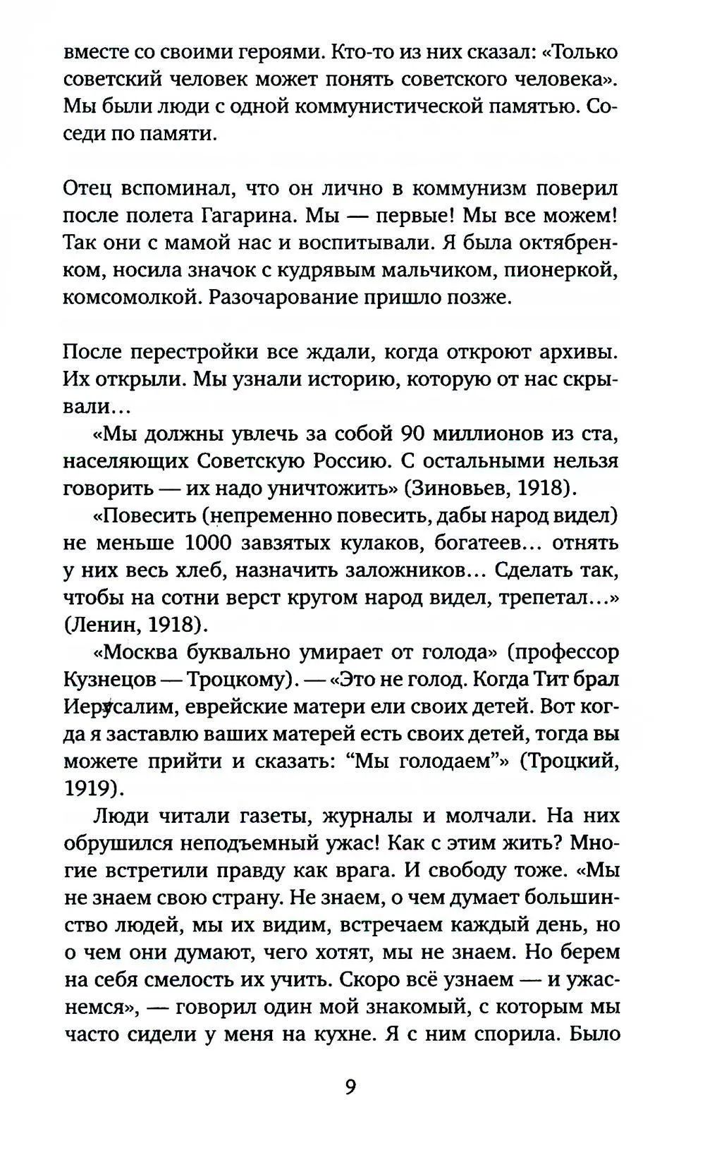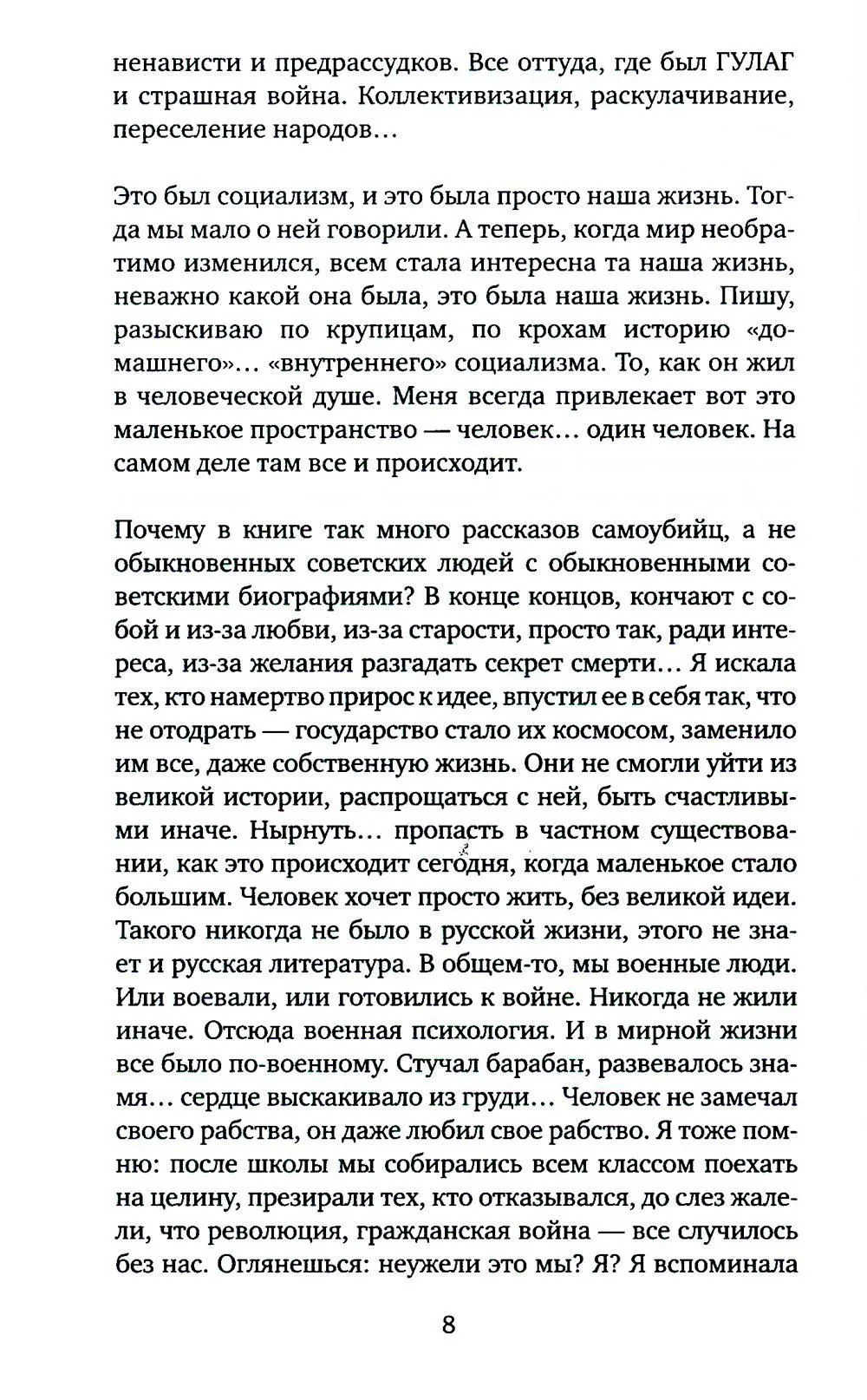 "У коммунизма был безумный план, - рассказывает автор, - переделать "старого" человека, ветхого Адама. И это получилось. Может быть, единственное, что получилось. За семьдесят с лишним лет в лаборатории марксизма-ленинизма вывели отдельный человеческий тип - homo soveticus. Одни считают, что это трагический персонаж, другие называют его "совком". Мне кажется, я знаю этого человека, он мне хорошо знаком, я рядом с ним, бок о бок прожила много лет. Он - это я. Это мои знакомые, друзья, родители".