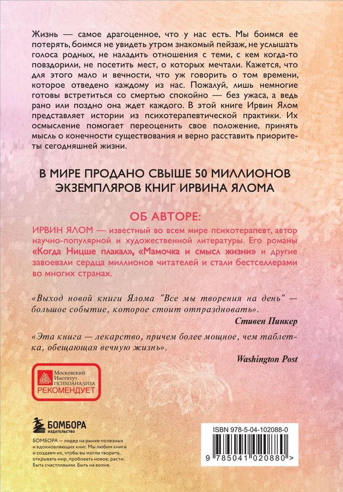 В своей книге известный американский психотерапевт Ирвин Ялом помогает читателю встретиться лицом к лицу с конечностью человеческой жизни. Он вдохновляет перестать бояться неизбежного, принять мысль о временности и начать ценить каждый настоящий момент. Благодаря его глубоким размышлениям и практическим советам, страх смерти становится не парализующим, а преобразующим опытом, открывающим путь к осознанной, наполненной радостью жизни.