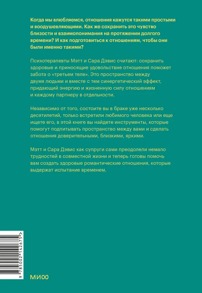 Психотерапевты Мэтт и Сара Дэвис считают: сохранить здоровые и приносящие удовольствие отношения поможет забота о "третьем теле". Это пространство между двумя людьми и вместе с тем синергетический эффект, придающий энергию и жизненную силу отношениям и каждому партнеру в отдельности.