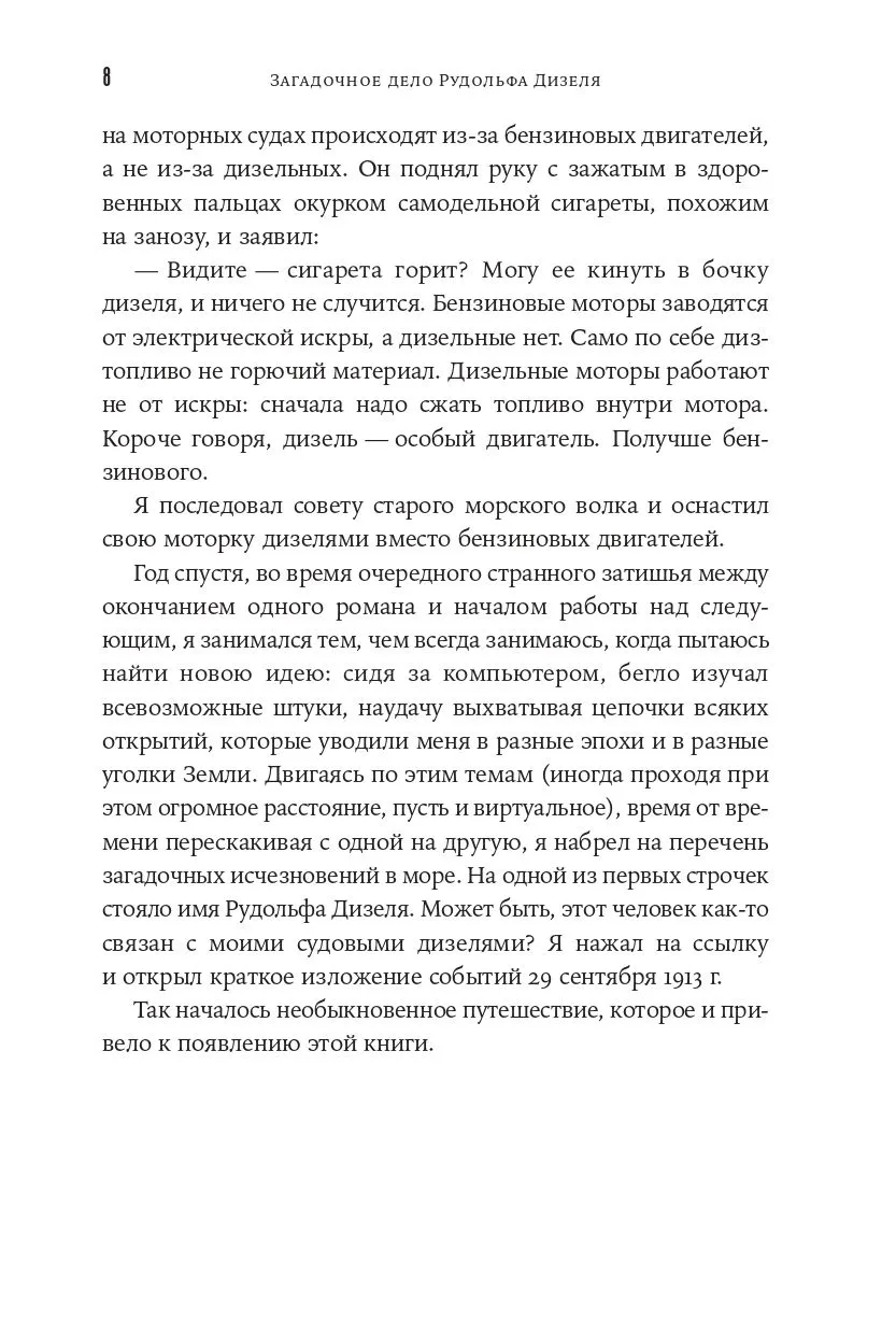В ваших руках — захватывающая биография и исторический детектив, ставший бестселлером по версии The New York Times. Дуглас Брант воссоздает жизнь блестящего изобретателя в бурную эпоху рубежа XIX–XX вв. На страницах книги переплетаются истории кайзера Вильгельма II и нефтяного магната Джона Рокфеллера, молодого политика Уинстона Черчилля и инноватора Томаса Эдисона — всех тех, кто так или иначе был связан с судьбой Дизеля. Опираясь на архивные источники, автор пытается разобраться, что произошло на борту «Дрездена» и кому помешал изобретатель, изменивший расстановку сил в глобальной экономике.