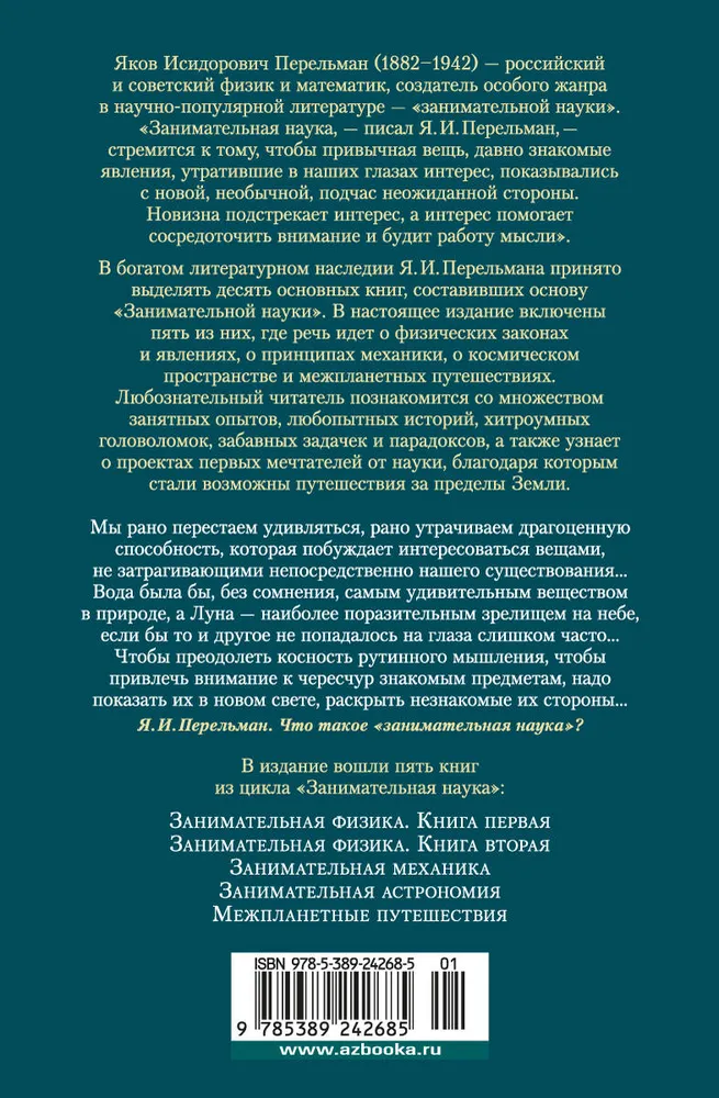 В богатом литературном наследии Я. И. Перельмана принято выделять десять основных книг, составивших основу «Занимательной науки». В настоящее издание включены пять из них, где речь идет о физических законах и явлениях, о принципах механики, о космическом пространстве и межпланетных путешествиях. Любознательный читатель познакомится со множеством занятных опытов, любопытных историй, хитроумных головоломок, забавных задачек и парадоксов, а также узнает о проектах первых мечтателей от науки, благодаря которым стали возможны путешествия за пределы Земли.