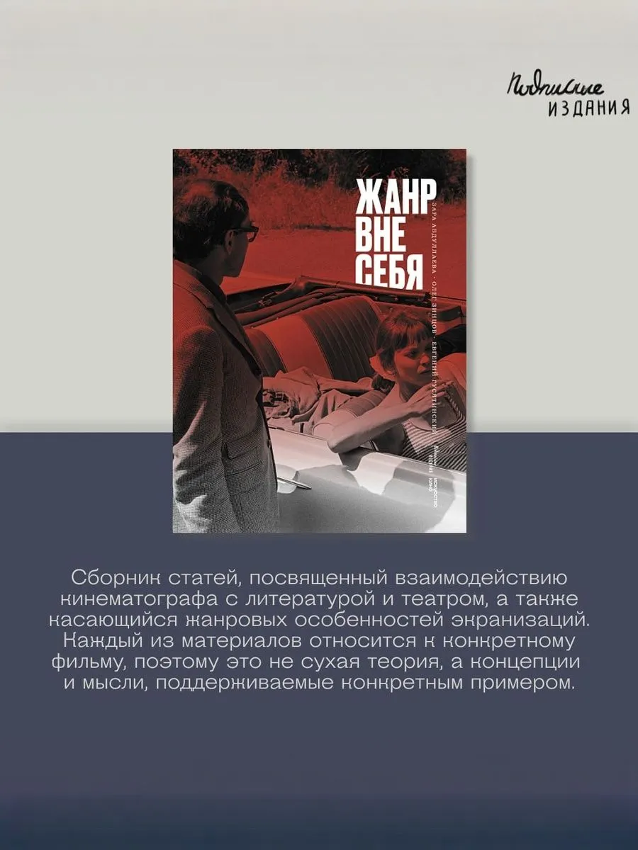Сюжет этой книги – приключения жанров в авторском кино. Привычно думать, что жанр определяет особенности мейнстримных картин, но он заложен в фундаменте поэтики любого индивидуального режиссёрского метода.Многообразный выбор фильмов, в которых переосмыслены жанровые конвенции, предполагает иное – нежданное – восприятие зрителей. В книге также публикуются диалоги Зары Абдуллаевой с Олегом Зинцовым и Евгением Гусятинским.