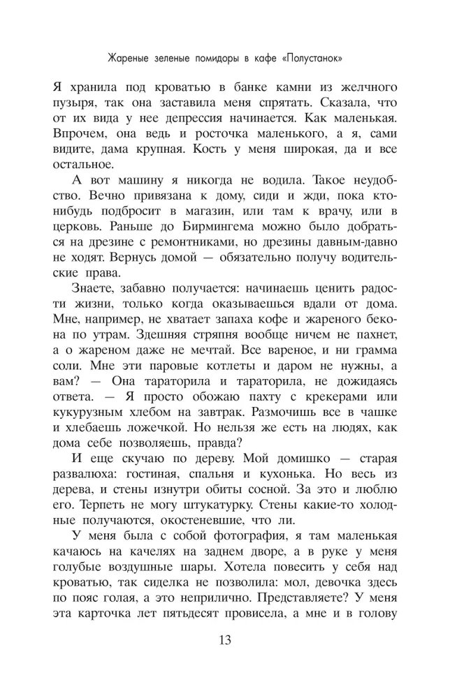 В центре ее воспоминаний — легендарное кафе и две женщины, Иджи и Руфь, которые в годы Великой депрессии умудрялись не только кормить весь город самыми вкусными жареными помидорами, но и противостоять несправедливости, расизму и жизненным невзгодам с поразительным мужеством и юмором.