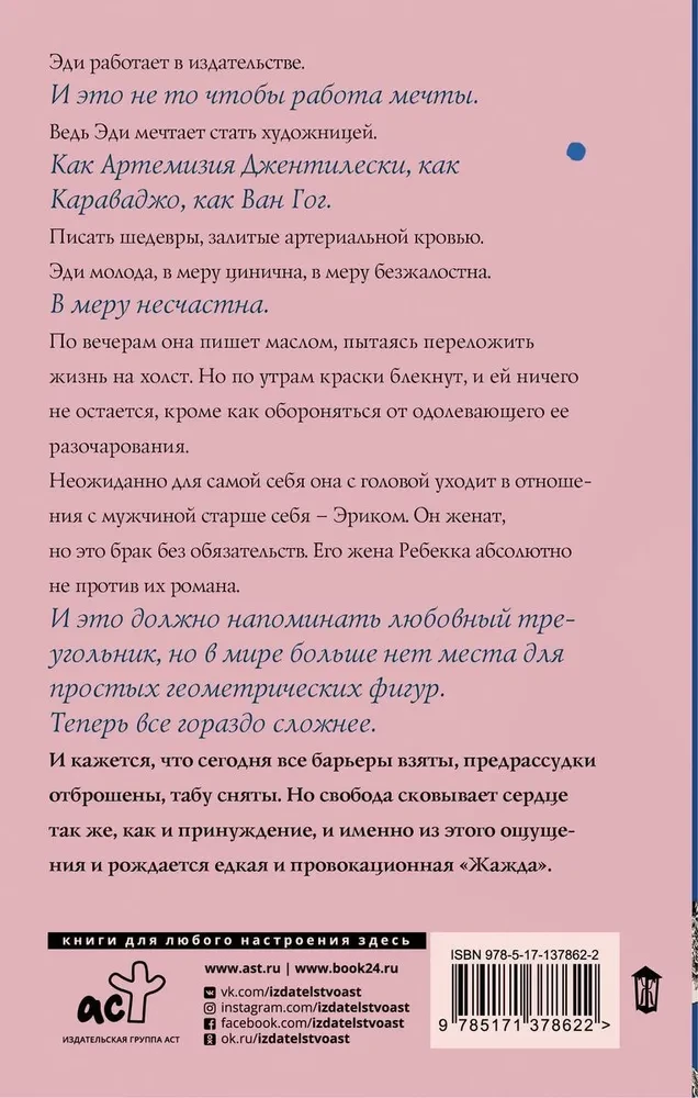 Роман «Жажда» — проникновенная история об Эди, мечтающей о свободе, искусстве и настоящих чувствах, её пути между любовью, разочарованием и поиском себя в современном мире без границ и табу.