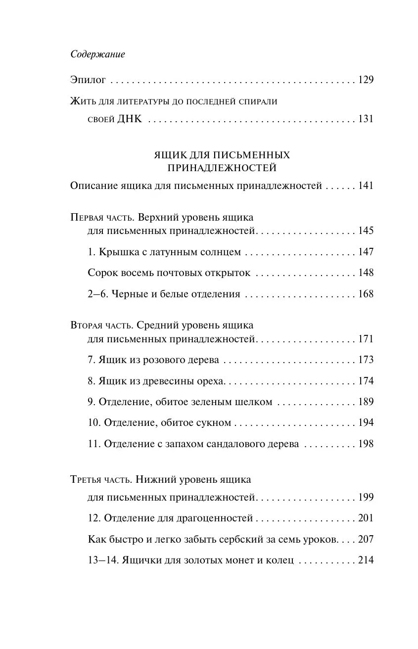История «Ящика для письменных принадлежностей» начинается в момент окончания. Внутри ящика — в открытках, объявлении, рецепте, рукописи, вырванных из книги страницах, на пленке и фотографии — запечатлена непростая история любви двух неординарных личностей. Она умеет читать запахи и дважды покупает соверешенно бесплатно самую дорогую шубу в Париже. Он ищет девушку с женской версией «Хазарского словаря» и забывает родной сербский язык за семь уроков. Их отношения измеряются любовными часами, которые отмеряют длительность любовного акта... Это роман-загадка, роман-лабиринт. Это рассказ без слов о том, что такое любовь.