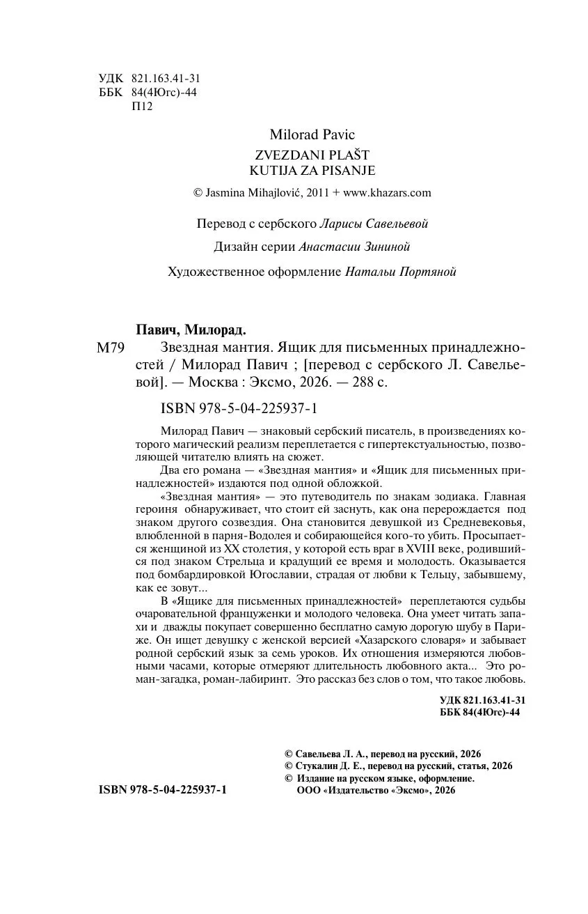 Милорад Павич — знаковый сербский писатель, в произведениях которого магический реализм переплетается с гипертекстуальностью. Это позволяет читателю влиять на сюжет. Два его романа - «Звездная мантия» и «Ящика для письменных принадлежностей» издаются под одной обложкой.